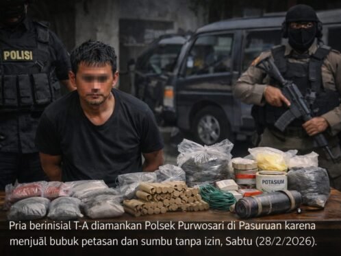 PASURUAN, PasuruanToday.com – Seorang pria berinisial T-A, warga Desa Sekarmojo, Kecamatan Purwosari, Kabupaten Pasuruan, Jawa Timur, ditangkap polisi setelah kedapatan memperjualbelikan bubuk petasan dan lembaran sumbu tanpa izin resmi. Kapolsek Purwosari Iptu Shanty Wijaya mengatakan, penangkapan dilakukan setelah pihaknya menerima laporan masyarakat terkait dugaan peredaran bahan peledak rakitan di wilayah tersebut. Polisi kemudian melakukan penyelidikan […]