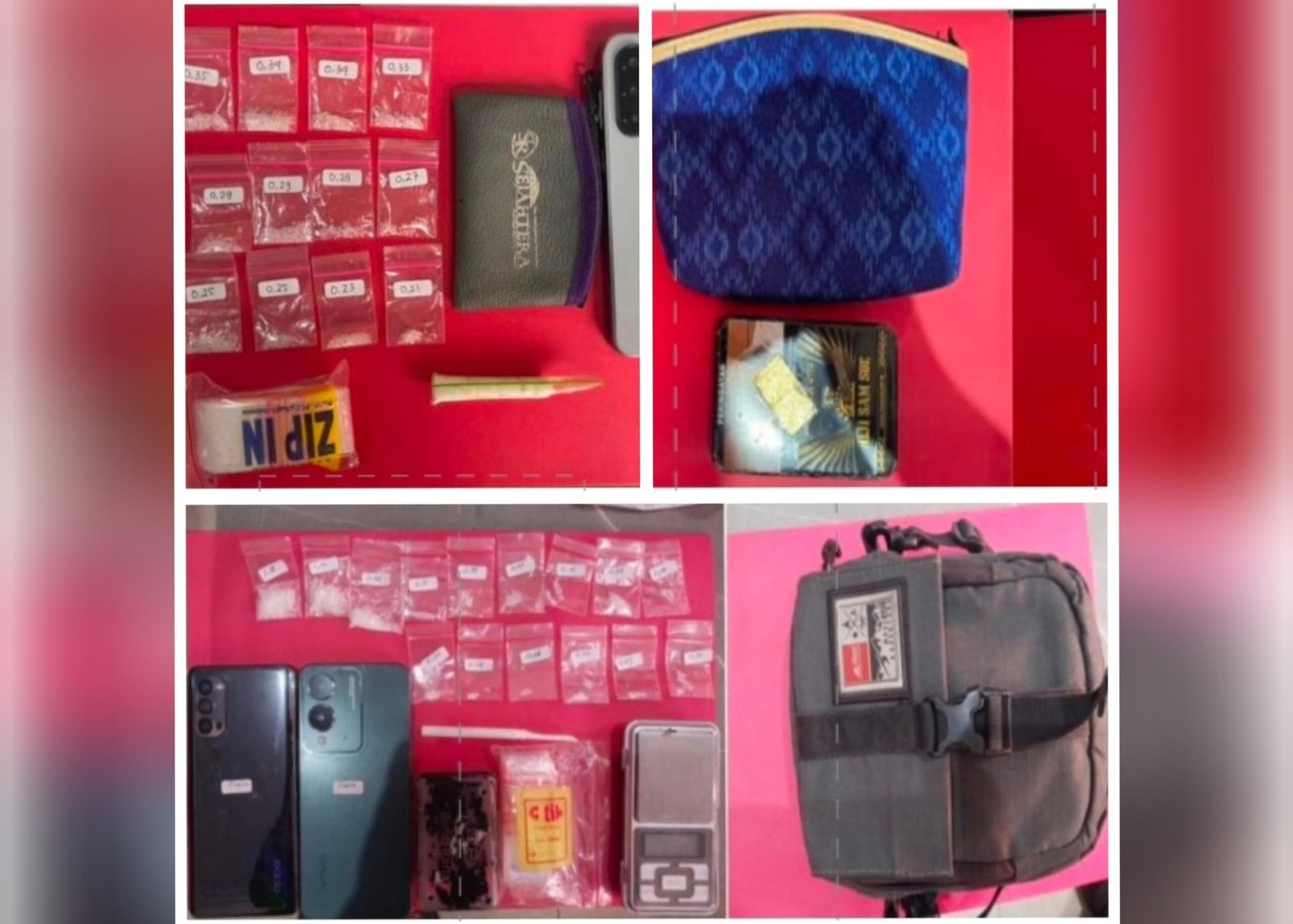 Polisi kembali menemukan 15 paket sabu, timbangan elektrik, dua telepon genggam, plastik klip kosong, alat skrop, dan tas selempang.